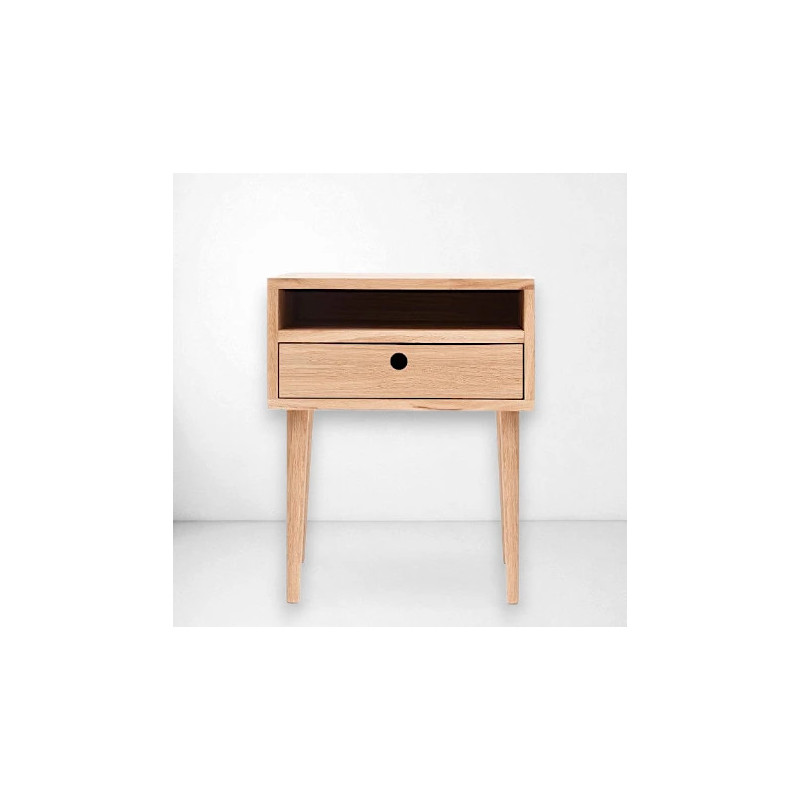 Minimalistyczna szafka nocna Luna z litego drewna dębowego to idealne połączenie estetyki i funkcjonalności. Wyposażona w praktyczną szufladę oraz otwartą wnękę, zapewnia wygodne przechowywanie najpotrzebniejszych przedmiotów przy łóżku. Naturalny materiał, ręczne wykonanie i ponadczasowy styl sprawiają, że doskonale pasuje do nowoczesnych i skandynawskich wnętrz.